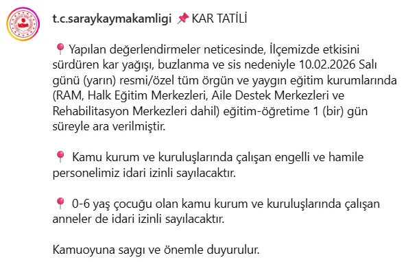 Alınan karar doğrultusunda, 10 Şubat 2026 Salı günü söz konusu üç ilçedeki tüm resmi ve özel eğitim kurumlarında eğitime 1 gün süreyle ara verilecek.