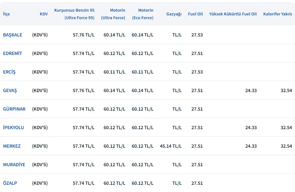 Van’da zam sonrası güncel litre fiyatları şu şekilde:
