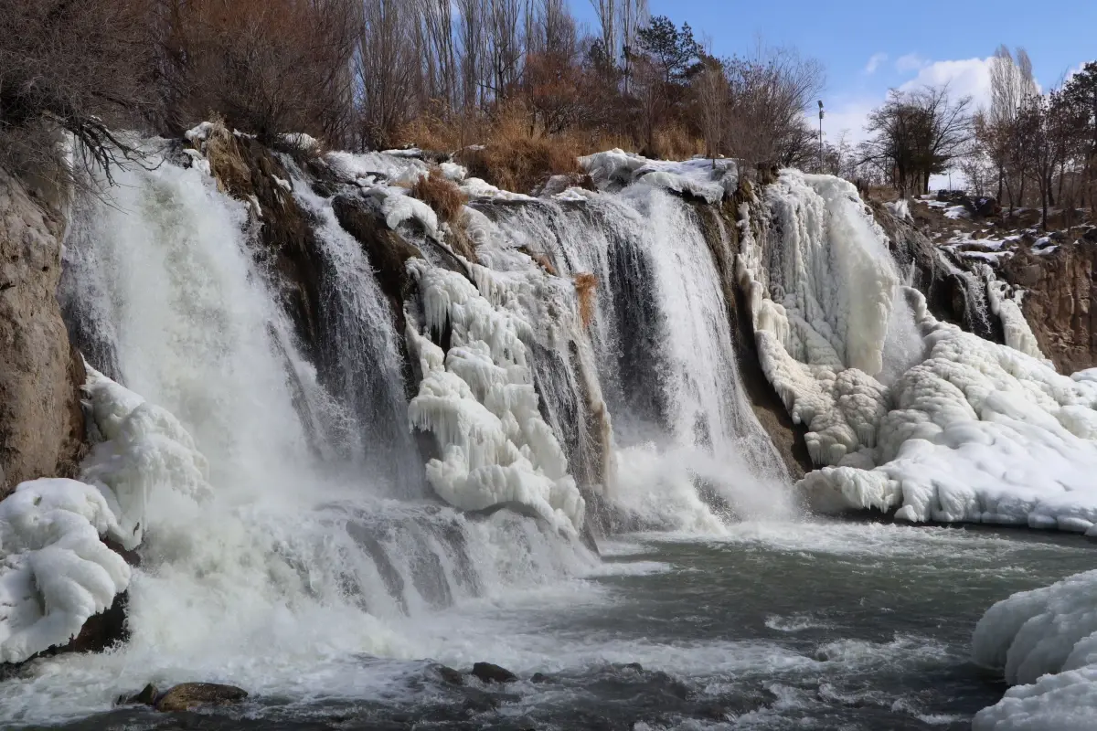 Muradiye Şelalesi Soğuk Hava ile Buzla Kaplandı