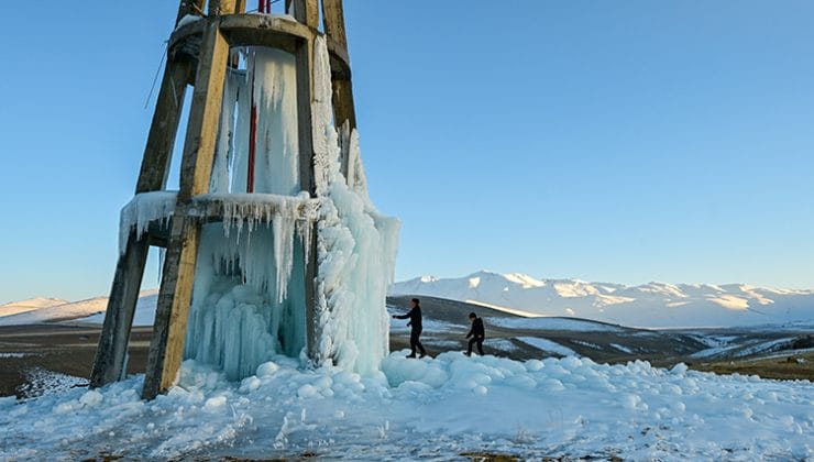 Gevaş’ın Kızıltaş Mahallesi’nde bulunan su deposunun boruları, aşırı soğuk nedeniyle patladı. Akan suların donmasıyla ortaya çıkan dev buz sarkıtları, ilginç görüntüler oluşturdu. Bölge halkı, buzla kaplanan depoyu cep telefonlarıyla görüntüledi.